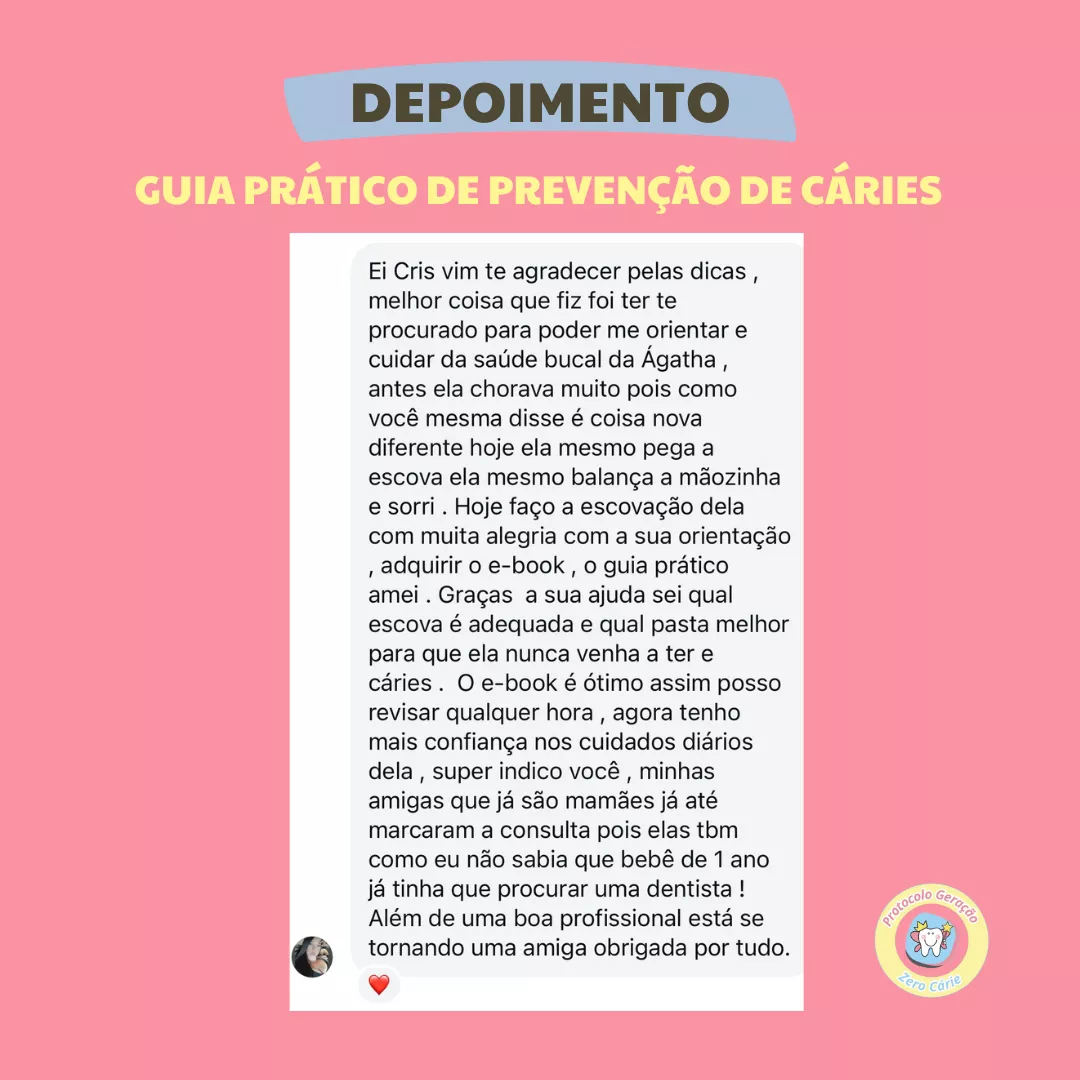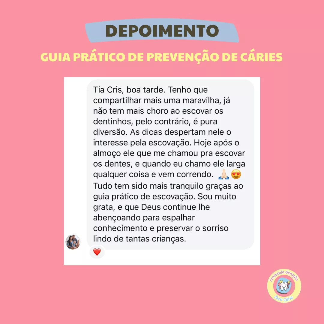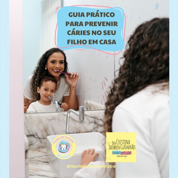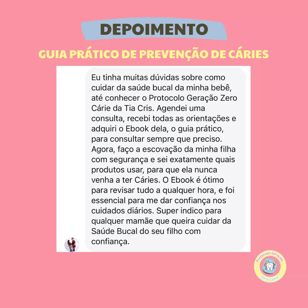 Conheça o GUIA PRÁTICO DE PREVENÇÃO DE CÁRIES EM CASA , desenvolvido pela Dra. Cristina, uma especialista em odontopediatria com mais de 11 anos de experiência, que já ajudou centenas de famílias a protegerem o sorriso de seus filhos. Com orientações simples e práticas, você poderá criar uma rotina de cuidados que transforma a escovação em um momento tranquilo e saudável!